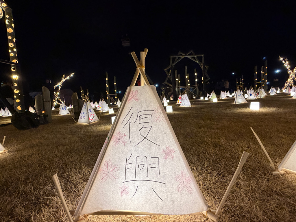 震災15年の節目となる今年は7回目の開催で 「三角灯ろう」など約760基が設置されており多くの人が訪れていました。